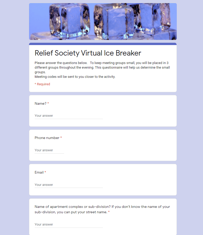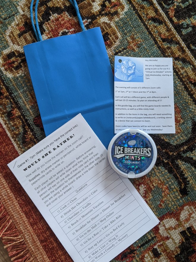 A couple of weeks ago, I hosted a virtual “ice breaker” activity. We have had quite a few people move into our church boundaries during this pandemic and haven’t been able to meet them. So I thought, “What better way, than to do a virtual activity with all the ladies in my ward?” It was so much fun and turned out better than I imagined. Here is what I did to make it a success.
