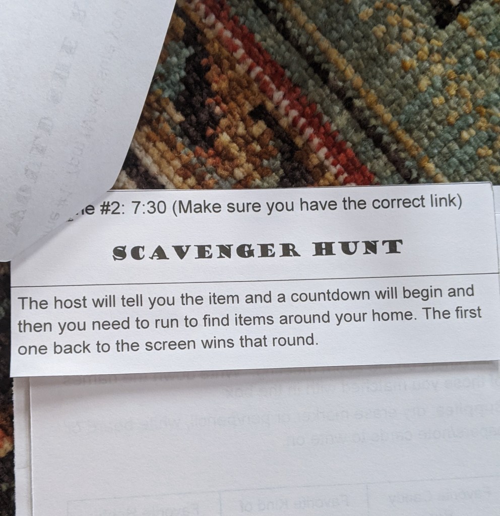 The first person who made it back to the screen got to go first and briefly tell everyone what their item was and why they chose it. Then they would get to pick the next person to speak about their item until everyone got a turn. We only had time to do about 4 scavenger rounds.