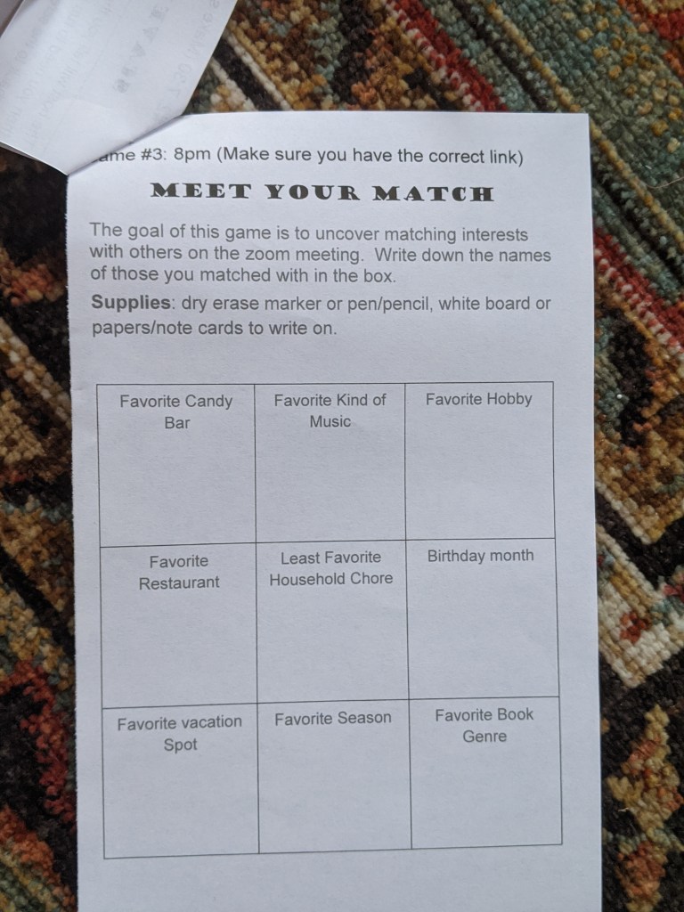 For Meet your Match, the way we played is that everyone started of muted. The host would move through the game board asking everyone to write down their favorite item. Then the host would ask everyone to show their board/paper/notecard. The other participants would look at the zoom call and see if they matched with others. If they did, they would write down the individual(s) names in the box. The host would move on to the next box. Once the host competed asking all the questions, THEN we would unmute and go over each questions and see who got the most, who they matched with, etc. But you can play it unmuted as well.
