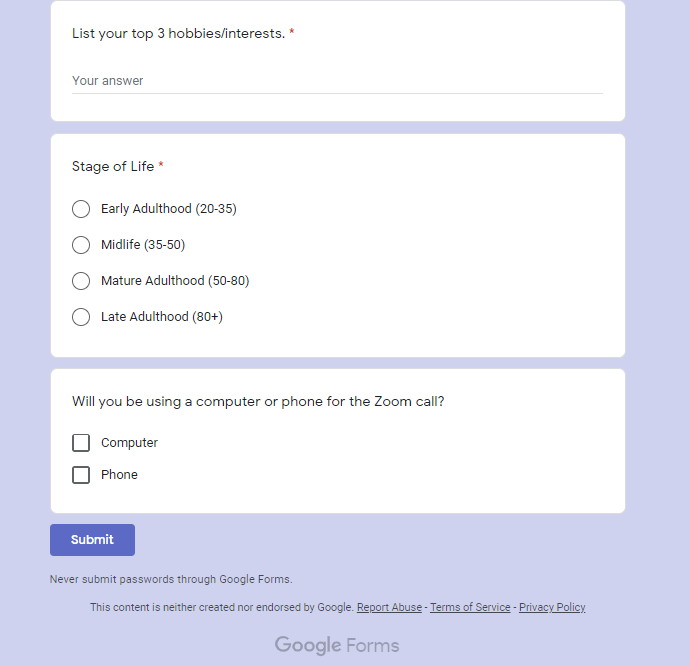 | Zoom Call #1 7-7:20pm | Zoom Call #2 7:30-7:50pm | Zoom Call #3 8-8:20pm |