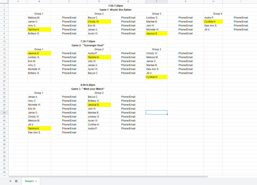 The people highlighted in yellow were the people I asked to be in charge of “hosting” the Zoom calls. They would set up the meetings before hand, send out the invites and moderate the game. More on that coming up.